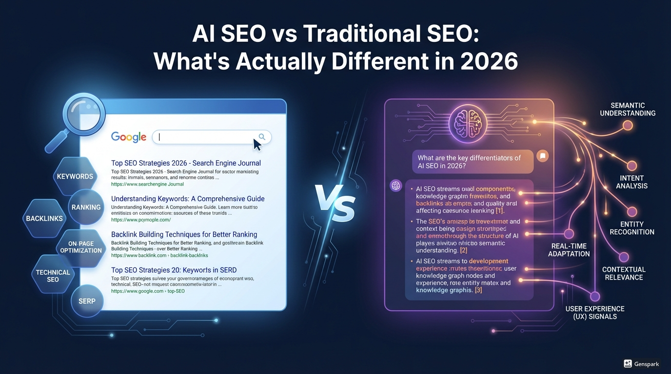 Traditional SEO success = ranking on page one and earning clicks. AI SEO success = being cited as a trusted source inside an AI-generated answer, regardless of your traditional ranking position.